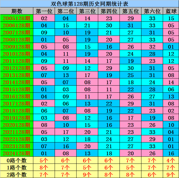 第一位:历史同时0路红球开出:03、06、09;1路红球开出;01、04、07;2路红球开出;02、05、08,红球012路个数比为5:8:7,现时2路红球历史同时轮空3年,本年同时阻扰2路红球出现,参考号码05。 第二位:历史同时0路红球开出:03、06、09、12、15;1路红球开出;04、07、10、13、16;2路红球开出;05、08、11、17,红球012路个数比为6:7:7,旧年同时开出2路奖号之后,本年同时防2路红球再出,参考红球11。 第三位:历史同时0路红球开出:12、15、18、21;1路红球开出;13、19;2路红球开出;08、11、14、17、20,红球012路个数比为6:5:9,现时2路红球历史同时轮空1年,本年同时阻扰2路红球出现,参考号码14。 第四位:历史同时0路红球开出:18、21、24、30;1路红球开出;16、19、22;2路红球开出;11、17、20、23、29,红球012路个数比为6:6:8,现在1路红球历史同时相对较冷,遗漏4年,本年同时合适选藏回补,看好红球25。 第五位:历史同时0路红球开出:18、24、27、30;1路红球开出;19、22、25、31;2路红球开出;17、20、23、26、29,红球012路个数比为7:5:8,旧年同时开出2路奖号之后,本年同时防2路红球再出,参考红球26。 第六位:历史同时0路红球开出:24、27、33;1路红球开出;19、28、31;2路红球开出;23、26、29、32,红球012路个数比为7:7:6,现在1路红球历史同时相对较冷,遗漏5年,本年同时合适选藏回补,看好红球28。