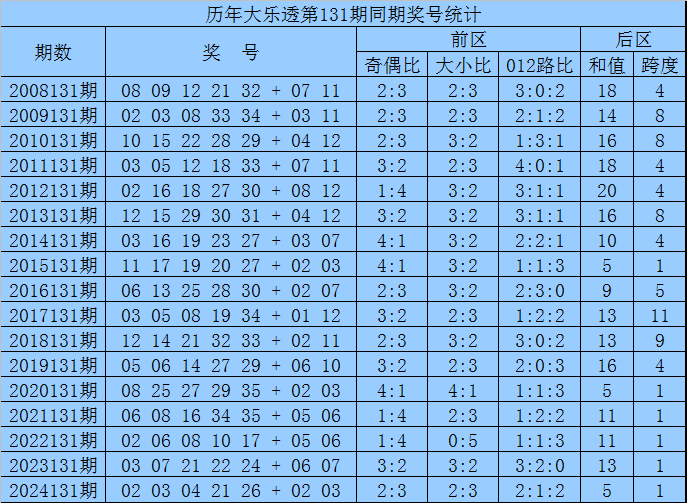 后别离析:在第131期历史同时开奖中,和值大小为7:10,跨度奇偶比为9:8,本期后区留神两码01和09。