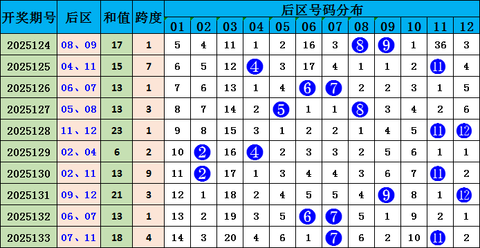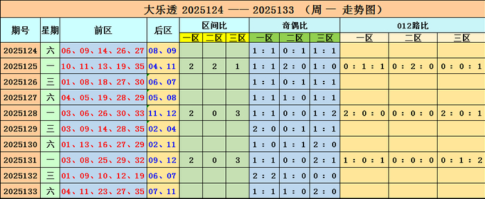 大乐透前区走势分析: 前第一区(01-12):上期该区开出2个04、11,上周一该区开出2个奖号03、08,最近10期该区开出21个奖号,最近10期星期一该区出现6个奖号,近10期断区0次,近10期星期一断区0次,本期看管该区落号,排斥断档。最近10期该区奇偶比12:9,其中星期一分别开极端偶比为1:1、1:1、1:1,奇偶数号码相对平出。最近10期星期一该区号码012路比为3:1:2,本期该区号码重心宥恕2码:04、11。 前第二区(13-24):上期该区开出1个23,上周一该区开出0个奖号,最近10期该区开出10奖号,最近10期星期一该区出现2个奖号,近10期断区2次,近10期星期一断区2次,本期看管该区落号,排斥断档。最近10期该区奇偶比为6:4,其中星期一分别开极端偶比为2:0、0:0、0:0,奇数号码相对热出。最近10期星期一该区号码012路比为0:2:0,本期该区号码重心宥恕1码:17。 前第三区(25-35):上期该区开出2个27、35,上周一该区开出3个奖号25、29、32,最近10期该区开出19个奖号,最近10期星期一该区出现7个奖号,近10期断区1次,近10期星期一断区0次,本期看管该区落号,排斥断档。最近10期该区奇偶比为12:7,其中星期一分别开极端偶比为1:0、1:2、2:1,奇数号码相对热出。最近10期星期一该区号码012路比为2:1:4,本期该区号码重心宥恕2码:25、30。 后分离析:上期后区开出号码07、11,为大大奇奇组合。上周一后区奖号为09、12,大大奇偶组合。近10期后区奇偶比为10:10,近5期奇偶比为5:5,本期后区瞻望小大偶奇组合热出,重心宥恕两码:02、07。