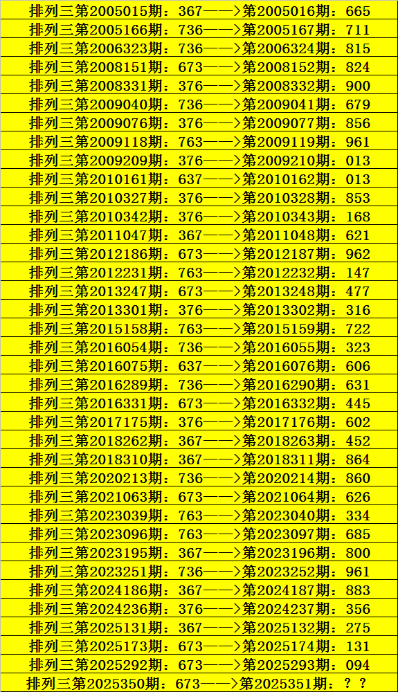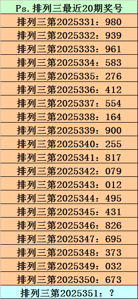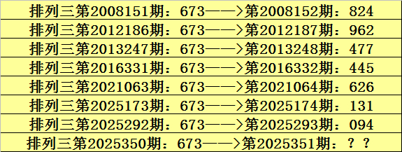 第2025350期摆设三奖号为673,历史上该号码直选出现8次,下期奖号分裂为:824、962、477、445、626、131、094。