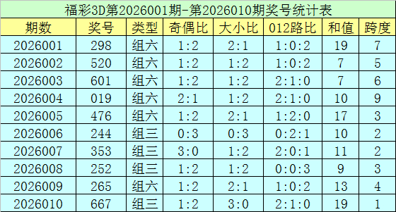 上期总结:福彩3D第2026010期开奖号码为667,组选类型为组三,奇偶比为1:2,大小比为3:0。