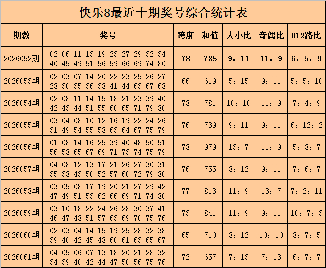 福彩快活8第2026061期开出奖号:04 05 06 07 13 18 20 21 28 32 34 39 40 42 44 47 50 56 75 76,其中奖号跨度开出72,和值开出657,大小比开出7:13,奇偶比开出7:13武警广西总队医院,012路比开出6:7:7。